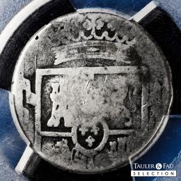 Este ejemplar presenta un desgaste moderado, completamente característico de una emisión que permaneció en uso durante décadas, con algunos golpes en el canto y unas ligeras incrustaciones en el reverso. Atractiva pieza histórica, rara en cualquier grado de conservación. Ag. 24,07 g. MBC-. Est...1500,00.