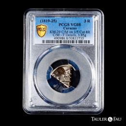 Curacao. 3 reaals (18 stuivers). ND (1819-1825). (Km-29). . 3,95 g. Resello de Curaçao, emitido por la ordenanza local del 13 de julio de 1818, sobre el reverso de 1/5 de un 8 reales de Fernando VII acuñado en México entre 1812 y 1821. Se trata de una atribución mucho más precisa de lo que suele ser posible en este tipo de moneda, debido a la inicial parcial del ensayador y al rostro del monarca en el reverso. Bonita pátina de monetario. Encapsulada por PCGS como VG 08 - C/M on 1/5 Cut 8R, F Details. Según un informe gubernamental fechado el 20 de diciembre de 1825, después de que el gobierno dejara de comprar dólares para hacer pequeñas monedas de 3 y 5 partes, el corte quedó abierto a todo el mundo y se convirtió en una práctica generalizada, aceptándose sin problemas las distintas fracciones. El informe también confirma su condición de fichas privadas y que se permitía su circulación general por convenio. Est...300,00.