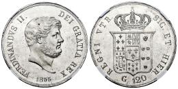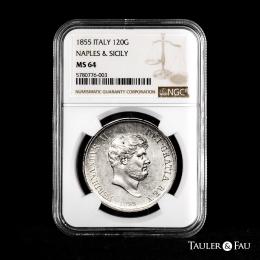 Italia. Reino de las dos Sicilias. Fernando II de Borbón (1830-1859). 120 grana. 1855. Nápoles. (Km-370). (Dav-ECT 175). (Mir-503/4). . Magnífico ejemplar con pleno brillo original. Muy rara en esta conservación. Encapsulada por NGC como MS 64. Solamente 1 ejemplar mejor conservado según el censo de NGC. Est...600,00.