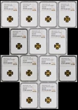 República Dominicana. Juego completo de 13 piezas de oro de 10 pesos “Iglesias Coloniales”, acuñadas en el año 2000, todas certificadas por NGC con calificaciones excepcionales en calidad Deep Prooflike. El conjunto incluye las siguientes piezas: Nuestra Señora del Carmen (MS 67, KM113), Santa Cruz de El Seibo (MS 69, KM116), Capilla de San Andrés (MS 69, KM122), Nuestra Señora del Rosario (MS 66, KM114), Capilla de los Remedios (MS 69, KM121), Catedral de Santo Domingo (MS 67, KM101, listada para plata), Santa Bárbara (MS 68, KM115), Santuario de Higüey (MS 67, KM120), Iglesia de Boyá (MS 69, KM112), San Miguel (MS 68, KM118), Regina Angelorum (MS 67, KM93), Banica (MS 69, KM111) y San Lázaro (MS 68, KM95). Un conjunto de extraordinaria calidad y atractivo visual, que reúne una de las series más apreciadas de la numismática dominicana moderna. Est...5000,00.