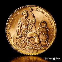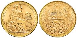 Perú. 100 soles. 1965. Lima. (Km-231). (Fried-78). Au. 46,75 g. Bonito color. Brillo original. EBC+. Est...4500,00.