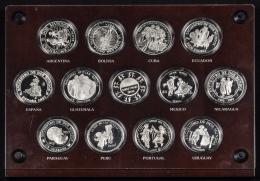 Juan Carlos I (1975-2014). I Serie Iberoamericana. 1992. Encuentro entre dos mundos. 14 monedas de una onza emitidas por Argentina, Colombia, Cuba, Brasil, Bolivia, Ecuador, Chile, Ecuador, España, México, Nicaragua, Perú, Portugal, Uruguay y Venezuela. Algunas con tono. Ag. Peso total: 378 g. Presentadas en estuche oficial. PROOF. Est...900,00.