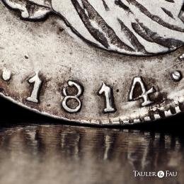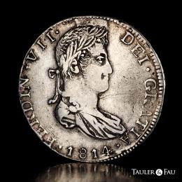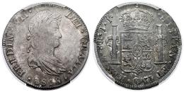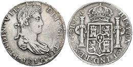 Fernando VII (1808-1833). 8 reales. 1814. Potosí. PJ. (Cal-1378). Ag. 26,90 g. Acuñación floja. Leves marquitas y hojita en el borde del anverso. Restos de brillo original. MBC+/EBC-. Est...180,00.