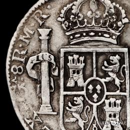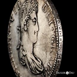 Fernando VII (1808-1833). 8 reales. 1824. Potosí. PJ. (Cal-1391). Ag. 26,91 g. Suave pátina con un ligero tono azulado en la periferia del reverso. MBC. Est...150,00.