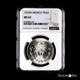 México. 1 peso. 1933. México. (Km-455). Ag. Brillo original. Encapsulada por NGC como MS 63. Est...45,00.