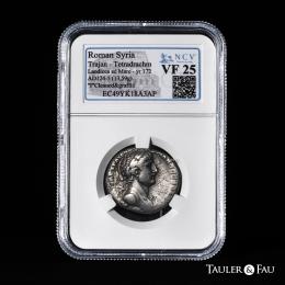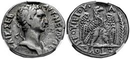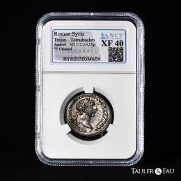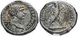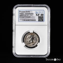 Trajano. Seleucis y Pieria. Tetradracma. 112 d.C. Antioquía. (McAlee-440). (Prieur-1505). Anv.: AYTOKP KAIC NEP TPAIANOC CEB ΓEPM ΔAK. Cabeza laureada a la derecha. Rev.: ΔHMAPX EΞ IϚ YΠATϚ. Águila en pie mirando de frente sobre maza, cabeza a la izquierda; palma en el campo derecho. . 14,13 g. Ligero tono en anverso. Encapsulada por NCV como XF 40. Cleaned. NCV-XF. Est...200,00.