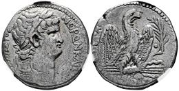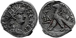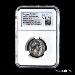 Nerón. Seleucis y Pieria. Tetradracma. RY 10 y CE 112 = 64 d.C. Antioquía. (RPC-I 4190). (Prieur-90). (McAlee-264). Anv.: ΝΕΡΩΝ ΚΑΙΣΑΡ ΣΕΒΑΣΤΟΣ. Busto laureado a la derecha, con aegis; (punto) abajo. Rev.: ΕΤΟΥΣ ΒΙΡ • Ι. Águila parada a la derecha sobre un rayo con las alas extendidas, punto y rama de palma a la derecha. . 14,93 g. Encapsulada por NCV como VF 30. Cleaned & Obv. scratch. NCV-VF. Est...200,00.