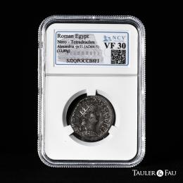 Nerón. Tetradracma. RY 11 = 64/5 d.C. Alejandría. Egipto. (RPC-I 5274). (Dattari (Savio)-271). (Emmett-118). Anv.: ΝΕΡΩ ΚΛΑV ΚΑΙΣ ΣΕΒ ΓΕΡ. Busto radiado a la derecha, con aegis. Rev.: ΑΥΤΟΚΡΑ. Águila con las alas plegadas en pie a la izquierda, con una palma a la altura del hombro; L IA (fecha) a la izquierda, simpulum a la derecha. . 13,09 g. Encapsulada por NCV como VF 30. NCV-VF. Est...200,00.