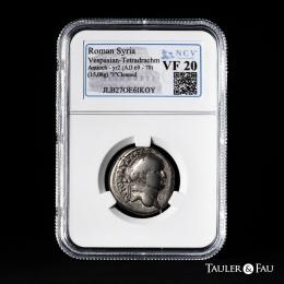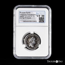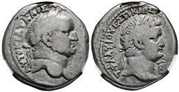 Vespasiano, con Tito como Caesar. Seleucis y Pieria. Tetradracma. HY 2 = 69/70 d.C. Antioquía. (RPC-II 1940). (Prieur-106A). (McAlee-328). Anv.: ΑΥΤΟΚΡΑΤ ΚΑΙΣΑ (ΟΥΕΣΠΑΣΙΑΝΟΥ). Cabeza laureada de Vespasiano a derecha. Rev.: T·ΦΛΑΥΙ ΟΥΕΣΠ ΚΑΙΣ Ε(ΤΟΥΣ ΝΕΟΥ ΙΕΡΟΥ). Cabeza laureada de Tito a derecha; estrella a la izquierda, B superada de barra (fecha) a la derecha. . 15,08 g. Ex Cgb.fr E-Shop 625966. Encapsulada por NCV como VF 20. Cleaned. NCV-VF. Est...200,00.