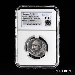 Galba. Seleucis y Pieria. Tetradracma. RY 2 = 68/9 d.C. Antioquía. (RPC-I 4198). (Prieur-100). (McAlee-308). Anv.: AY(TOKPATѠP ΓAΛBAC) KAICAP CEBACTOC. Cabeza desnuda a la derecha. Rev.: Águila en pie a la izquierda con las alas extendidas sobre una corona abierta, sosteniendo la corona en el pico; ЄTOVC B (fecha) en el exergo. . 13,51 g. Rara. Ex Cgb.fr E-Shop 625929. Encapsulada por NCV como F 15. Cleaned. NCV-F. Est...250,00.