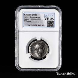 Otho. Seleucis y Pieria. Tetradracma. RY 1 = 69 d.C. Antioquía. (RPC-I 4199). (Prieur-101). (McAlee-316). Anv.: AYTOKPATѠP M OΘѠN KAICAP CЄBACTOC. Cabeza laureada a la derecha. Rev.: Águila en pie de frente sobre una corona, cabeza a la izquierda, con corona en el pico; palma en el campo izquierdo, creciente entre las patas; ЄTOVC A (fecha) en el exergo. . 14,52 g. Rara. Encapsulada por NCV como VF 25. Cleaned. NCV-VF. Est...300,00.