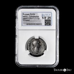 Nerva. Seleucis y Pieria. Tetradracma. HY 1 = 96/7 d.C. Antioquía. (RPC-III 3476). (Prieur-149). (McAlee-419). Anv.: AVT NEPOVAΣ KAIΣ ΣEB. Busto laureado a la derecha, con aegis alrededor del cuello. Rev.: ETOVΣ NEOV IEPOV. Águila en pie de frente sobre un rayo, cabeza a la derecha, con las alas extendidas; a la derecha, A superada de barra (Año) sobre una hoja de palma. . 13,51 g. Rara. Encapsulada por NCV como VF 25. Cleaned. NCV-VF. Est...300,00.