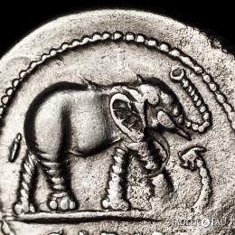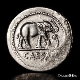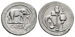 Julio César. Denario. 54-51 a.C. Galia. (Ffc-50). (Craw-443/1). (Cal-640). Anv.: Elefante a derecha, delante una serpiente, en el exergo: CAESAR. Rev.: Símpulo, aspersorio, hacha y apex. . 3,86 g. Acuñación muy bien centrada sobre un flan muy amplio. Ligero vano. Marca de banquero en el anverso. MBC+. Est...1500,00.