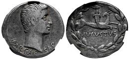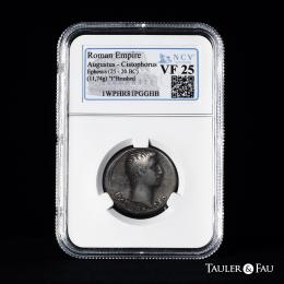 Augusto. Cistóforo. 25 a.C. Epheso. Ionia. (Ric-I 477). (Rpc-I 2213). (Bn-916). Anv.: IMP•CAESAR. Cabeza desnuda a la derecha. Rev.: AVGVSTVS. Capricornio a la derecha, cabeza a la izquierda, cornucopias en su espalda; todo dentro de una corona. . 11,74 g. Escasa. Encapsulada por NCV como VF 25. Brushed. NCV-VF. Est...400,00.