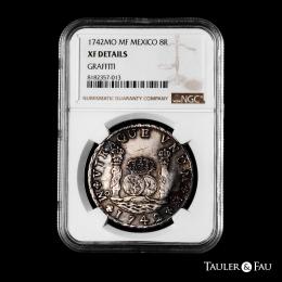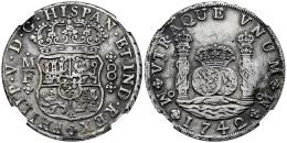 Felipe V (1700-1746). 8 reales. 1742. México. MF. (Cal-1461). Ag. Ligero tono. Alguna raya y graffiti sobre la corona. Encapsulada como XF Details, Graffiti. Est...400,00.