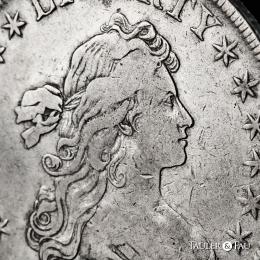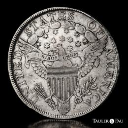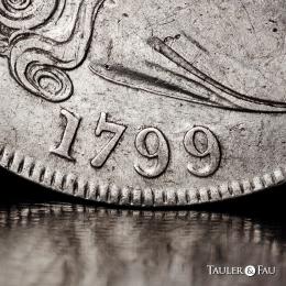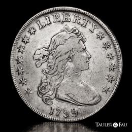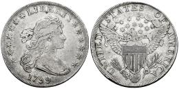 Estados Unidos. Draped Bust Dollar. 1 dollar. 1799. Philadelphia. (Km-32). Ag. 26,77 g. 7 y 6 estrellas al lado del busto y 13 flechas en reverso. Leyenda completa en canto. Limpiada. Rara. MBC-/MBC. Est...650,00.