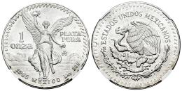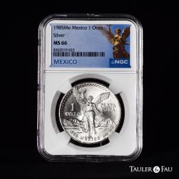 México. 1 onza. 1985. México. (Km-494.1). Ag. Pleno brillo original. Encapsulada por NGC como MS 66. Est...100,00.