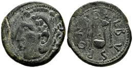 Gades-Gadir. Época de Augusto. Dupondio. 27 a.C-14 d.C. Cádiz. (Abh-1386). (Acip-3320a). Anv.: Cabeza de Tiberio joven a izquierda, delante NERO. Rev.: Símpulo a derecha, alrededor TI. CLA(VDI)VS. . 14,47 g. Contramarca de barra o línea en anverso (Tesorillo Tipo 5-58). Escasa. MBC/MBC-. Est...150,00.