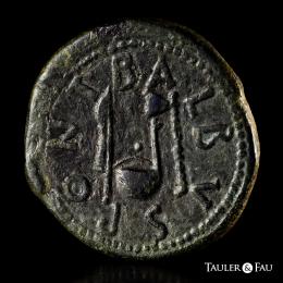 Gades-Gadir. Época de Augusto. Sestercio. 27 a.C-14 d.C. Cádiz. (Abh-1364). (Acip-3315a). Anv.: Cabeza de Hércules a izquierda, detrás clava. Rev.: Cuchillo, símpulo y hacha, alrededor leyenda de lectura interna BALBVS. PONT. . 35,31 g. Contramarca de barra o línea en anverso (Tesorillo Tipo 5-58). Muy rara. MBC. Est...400,00.