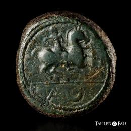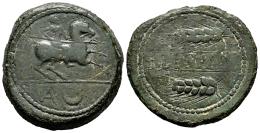 Obulco. As. 220-20 a.C. Porcuna (Jaén). (Abh-1791). (MIB-159/14e). (Acip-2197 var.). Anv.: Cabeza femenina a derecha, delante OBVLOC. Rev.: Arado a izquierda, letra ibérica TA encima de la espiga, entre ambos leyenda ibérica a izquierda ORKAILV/NTUSTULDUKO. . 22,78 g. De las letras E del reverso, la primera es romboidal y la segunda circular. Escasa. MBC-/MBC. Est...75,00.